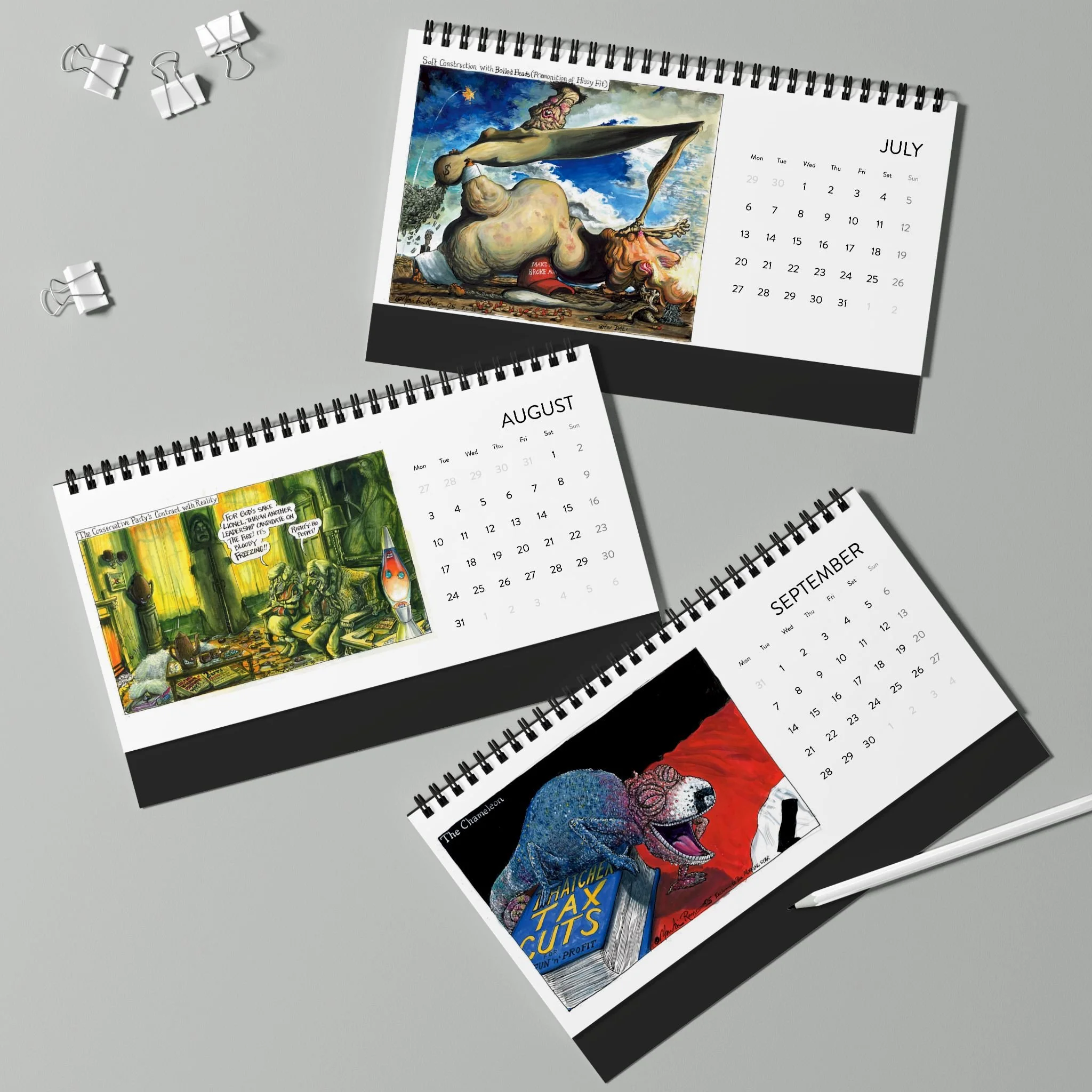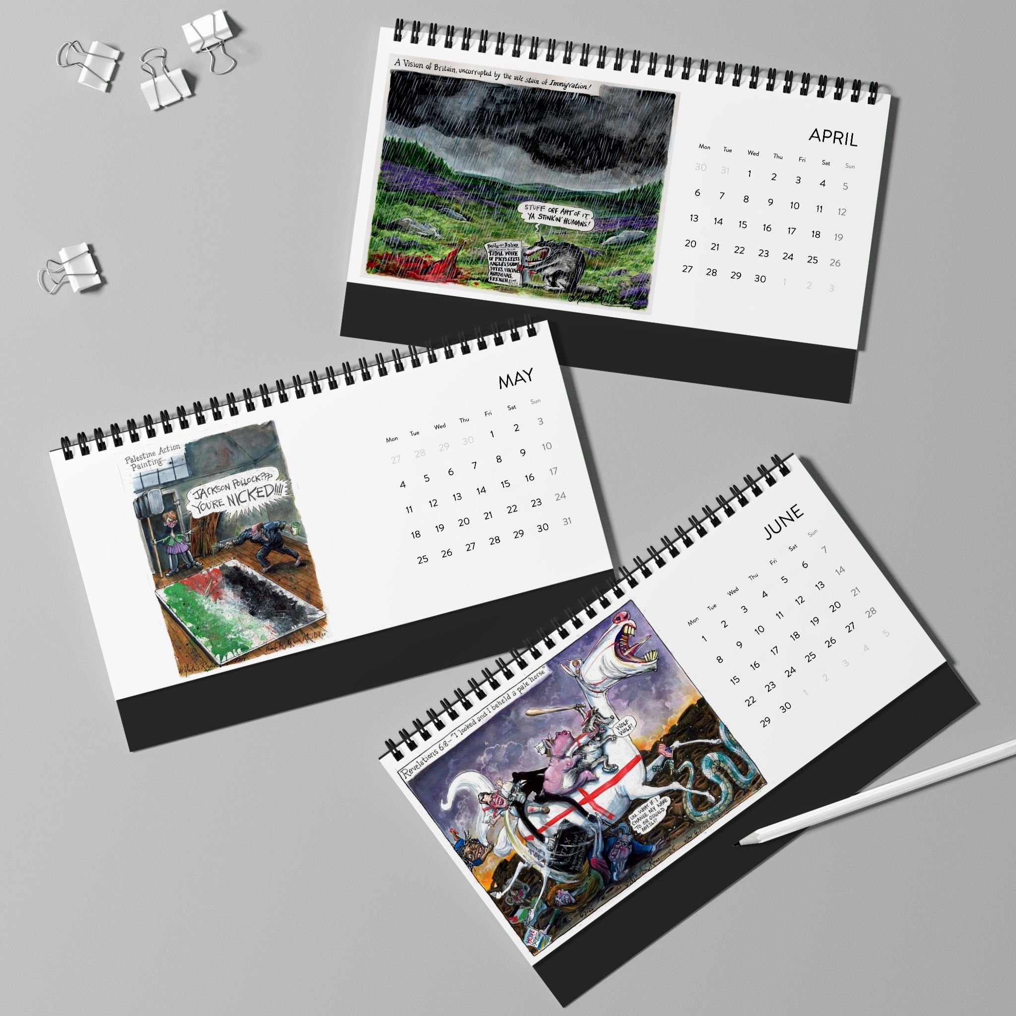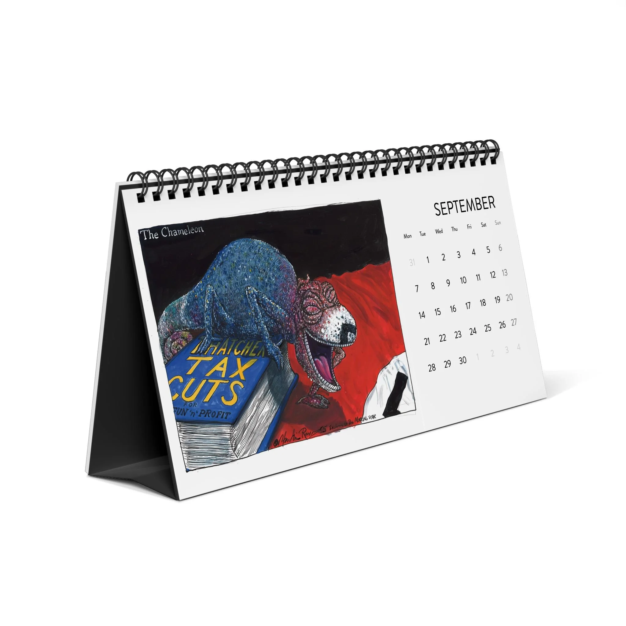 the Martin Rowson 2026 Calendar has a satin finish and a warped sense of humour . Each calendar comes in one size of 10" by 5", and comes with black spiral binding as well as a tent backing card.