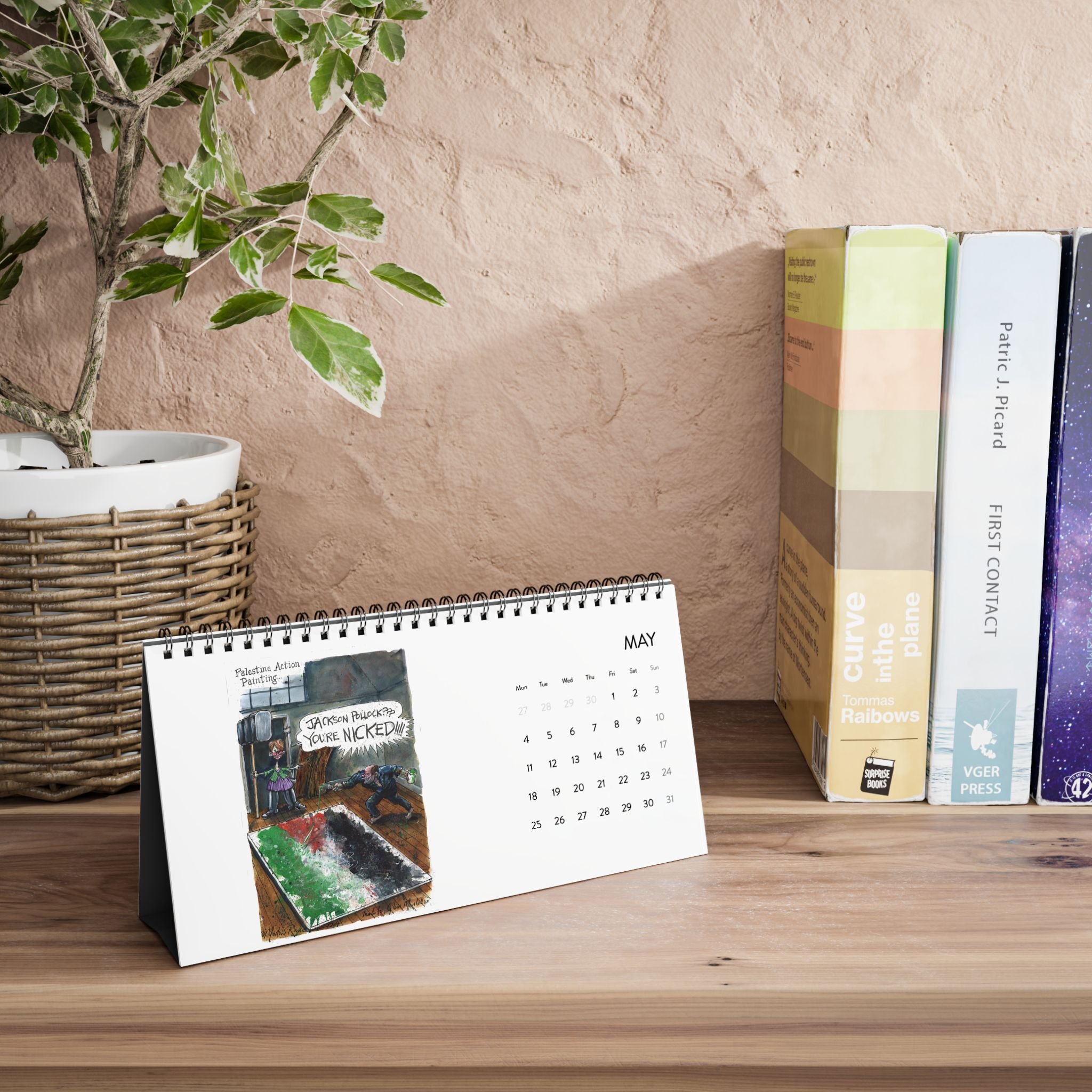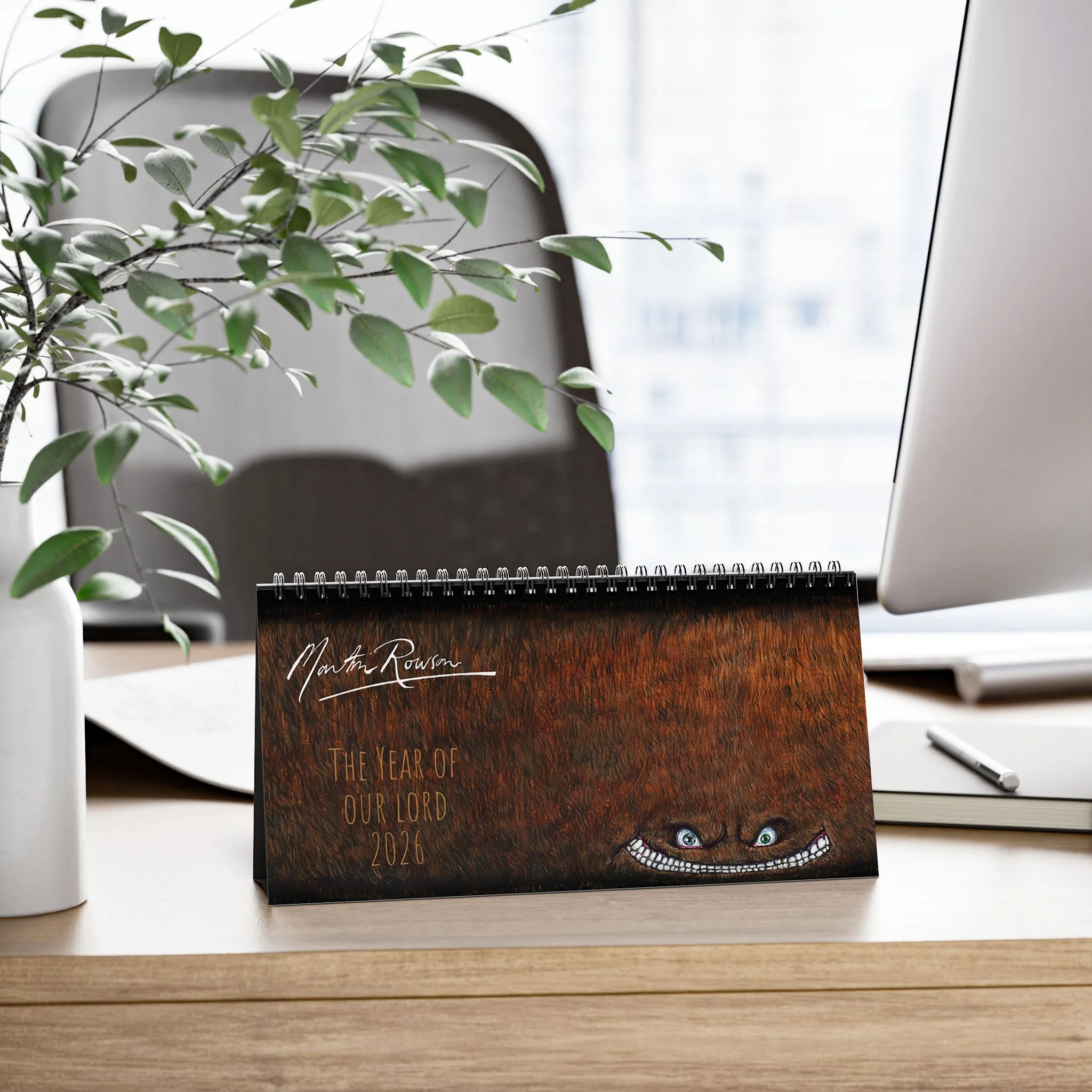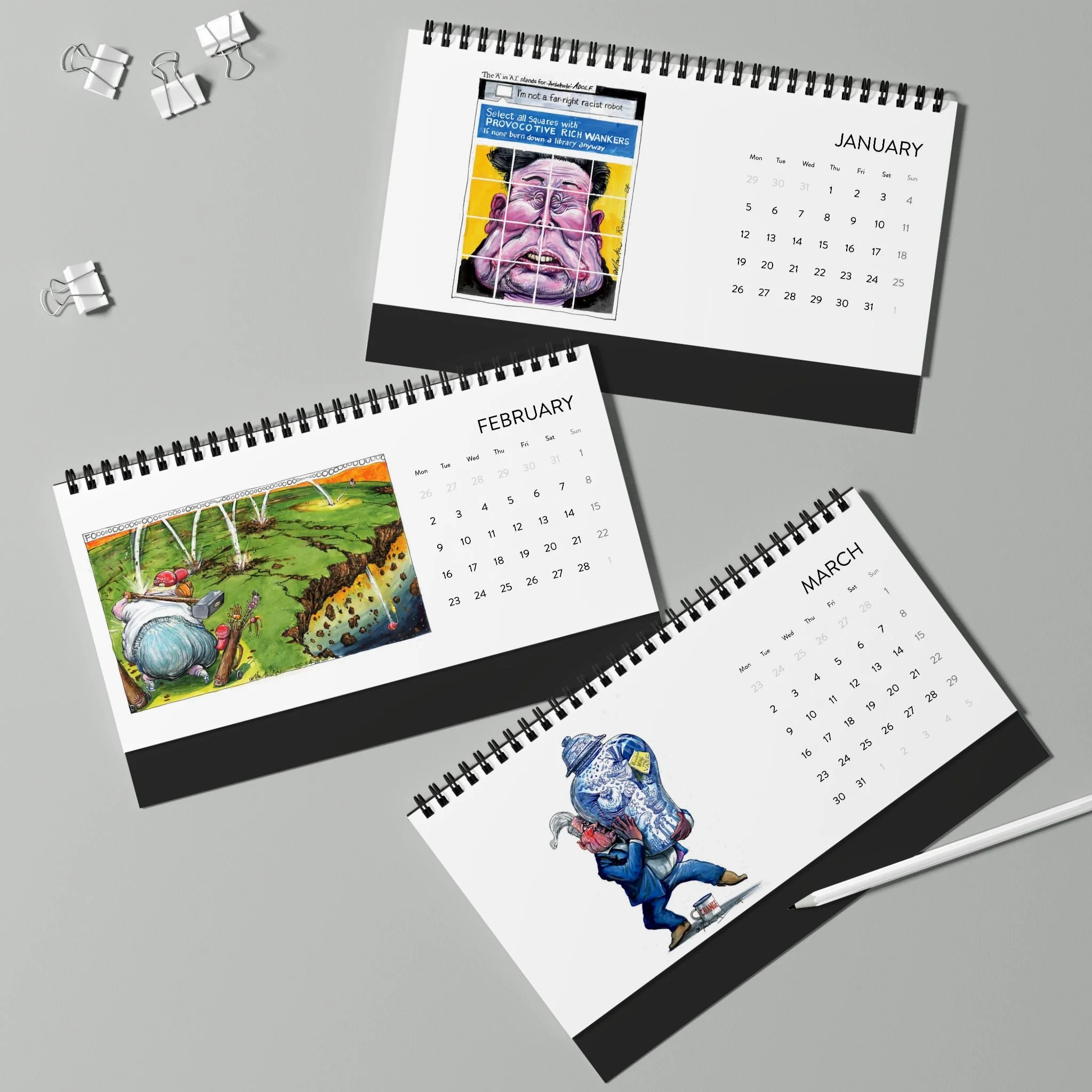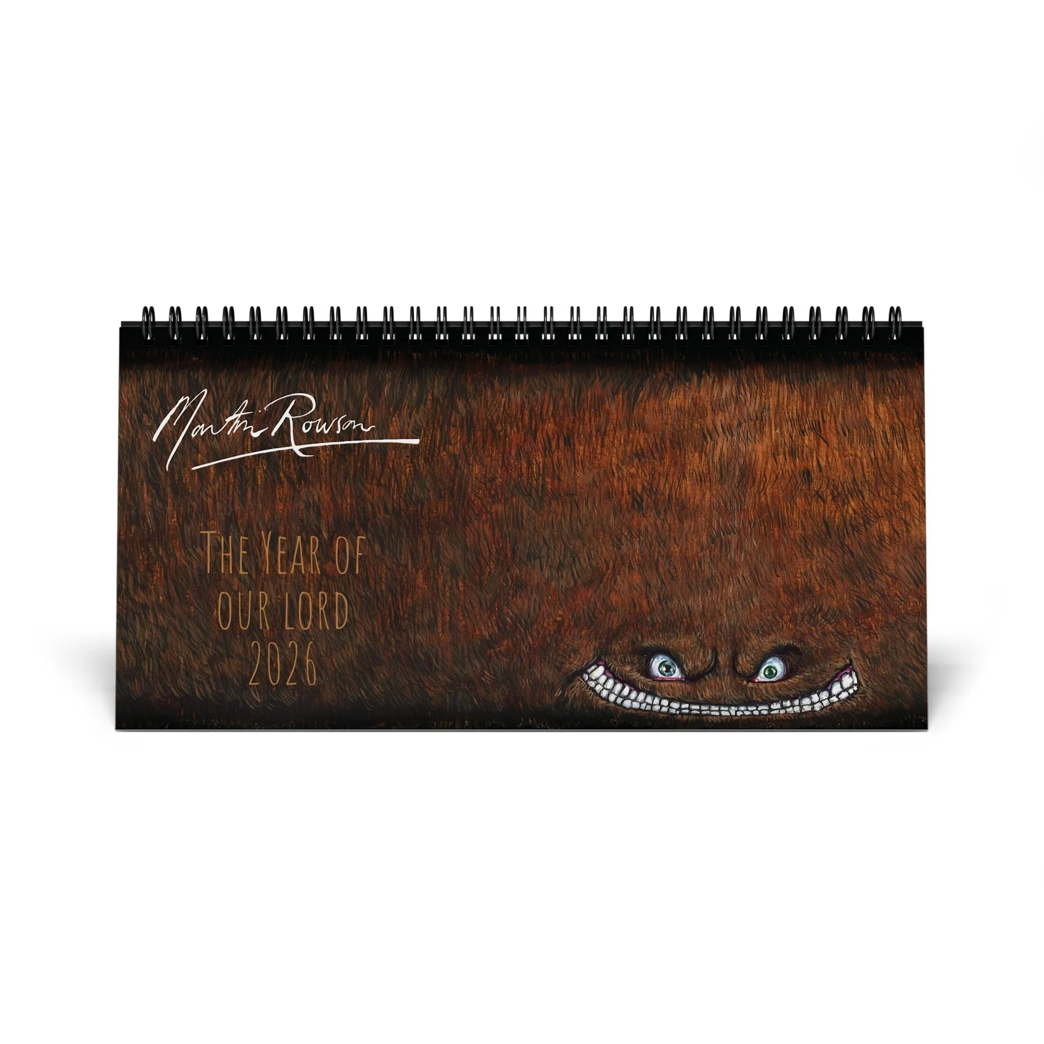 the Martin Rowson 2026 Calendar has a satin finish and a warped sense of humour . Each calendar comes in one size of 10" by 5", and comes with black spiral binding as well as a tent backing card.